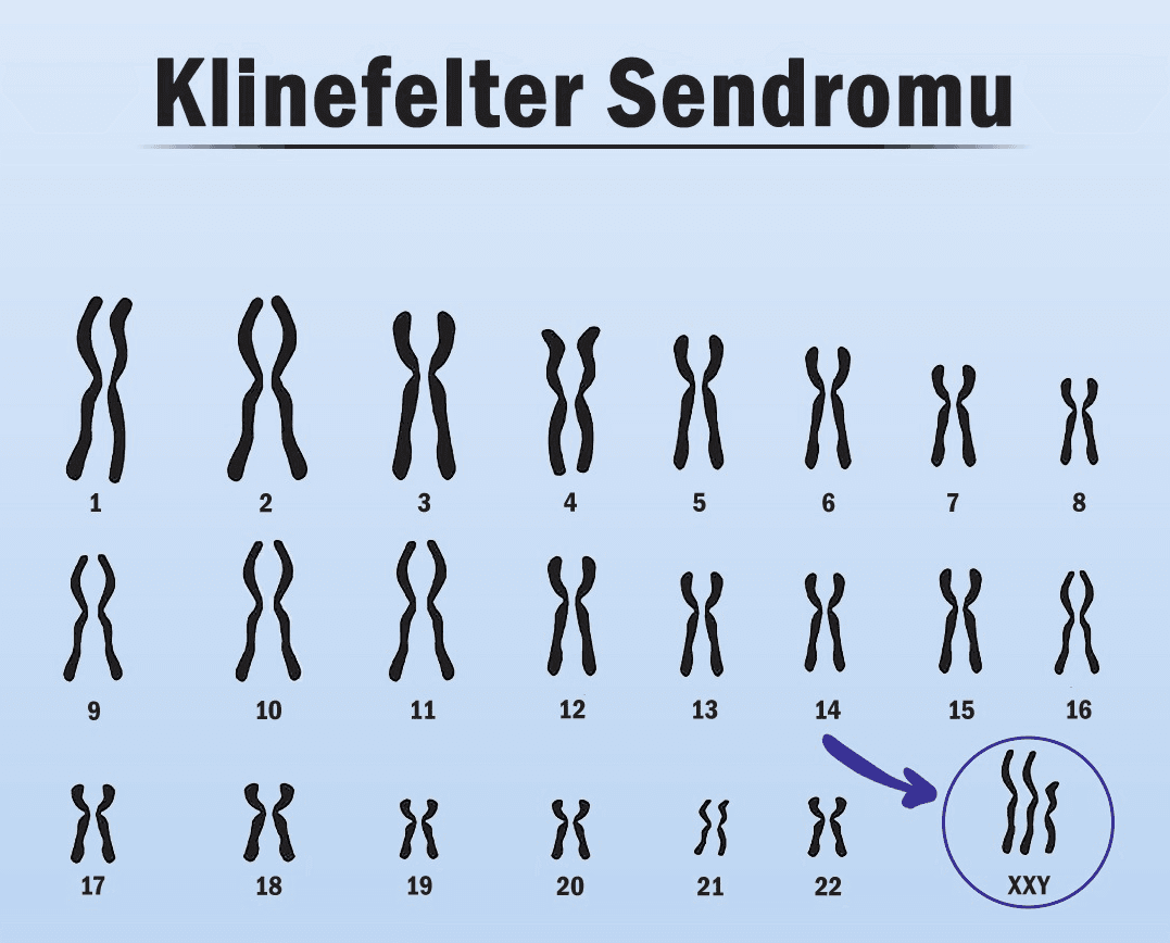 Kromozom analizi sonucunda 46 XY çıkması beklenirken 47 XXY sonucu çıkarsa hastada Klinefelter Sendromu tespit edilir. FSH ve LH hormonlarının kandaki oranı yüksek çıkabilir. Yetersiz testosteron hormonu üretimi ergenlik başlangıcını geciktirir ve ileri zamanlarda kısırlık durumu ile karşı karşıya kalınabilir.